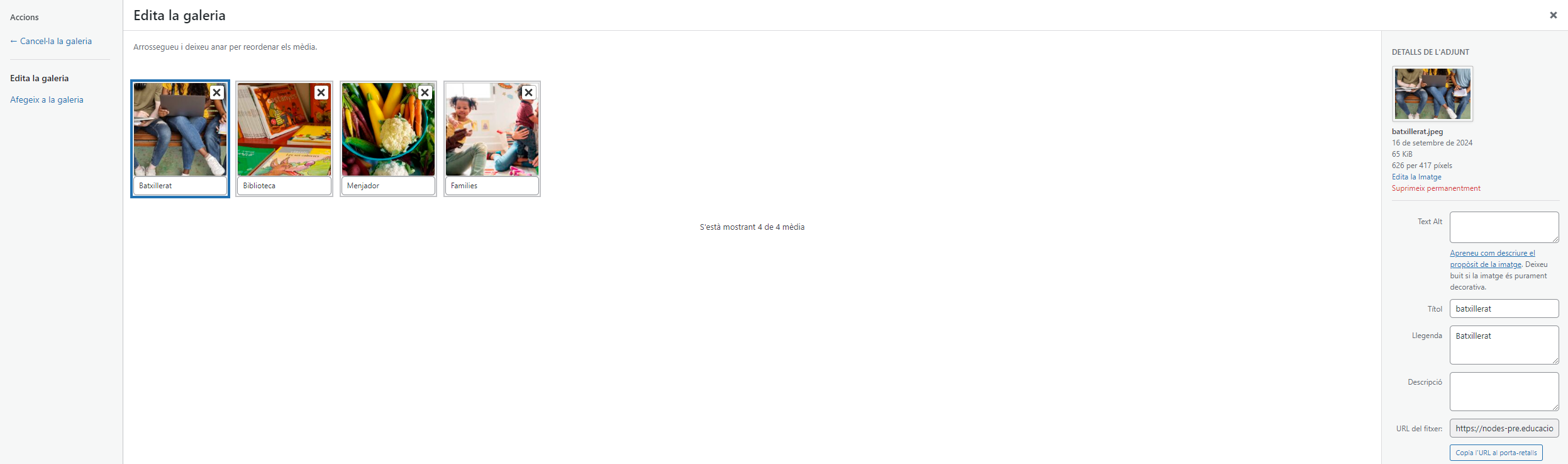 Un cop seleccionades les imatges, tindreu opció d’afegir-ne més posteriorment, pujant de noves o seleccionant-les a la Mediateca; també, des de la Mediateca, podreu editar l’ordre de les imatges i afegir títols, entre d’altres.
