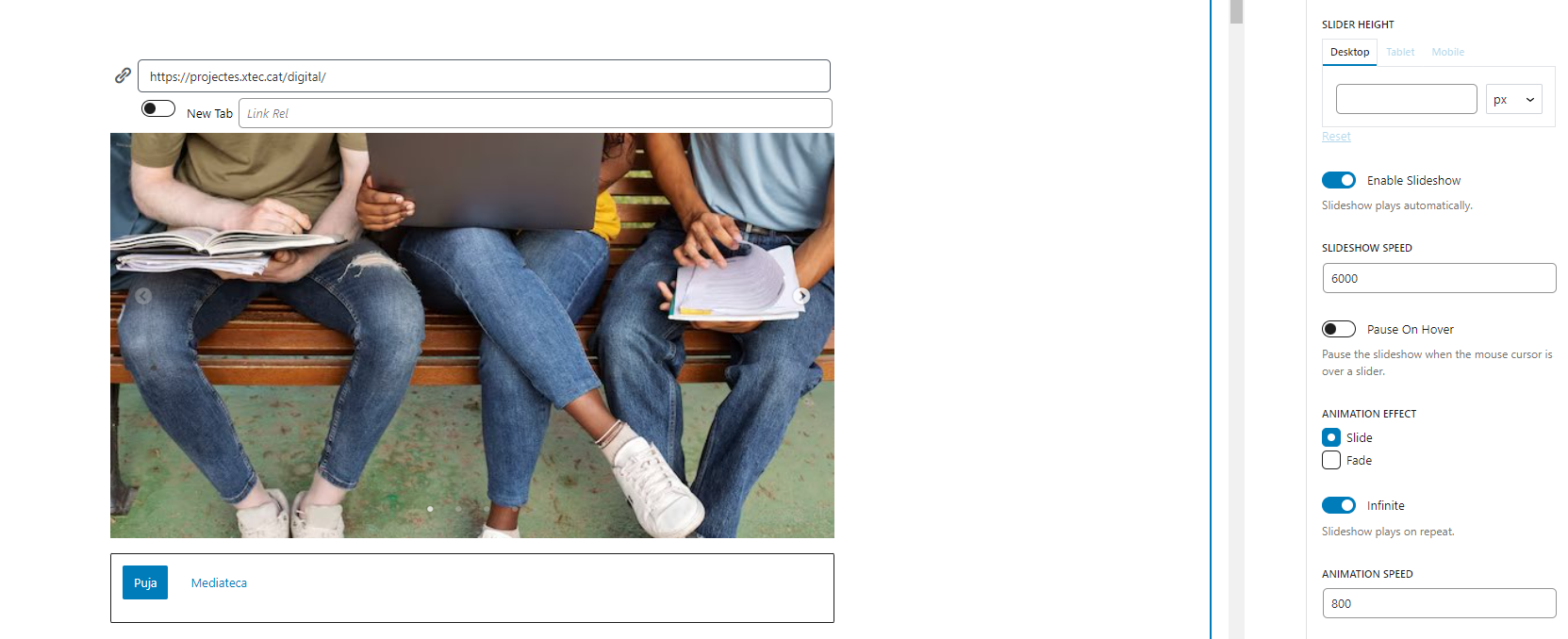 - Enllaç a les imatges (Link to): Destaquem la possibilitat de triar l’opció d’enllaçar un URL a cada imatge (custom link per slide), enllaç a on es redirigirà la pàgina quan premeu la imatge.