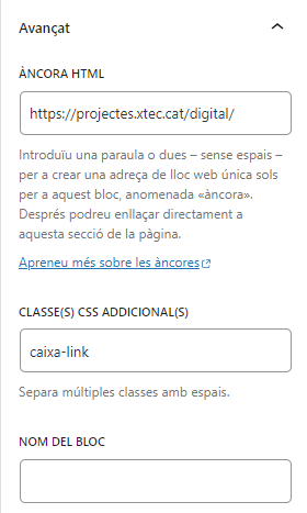 - Caixa-link: Escrivint “caixa” a “classe(s) CSS addicional(s)”, i enllaçant la pàgina web desitjada a “àncora HTML”, la columna seleccionada queda encaixada amb una vora arrodonida, i si cliqueu sobre la columna, se us redirigeix a la pàgina web enllaçada.