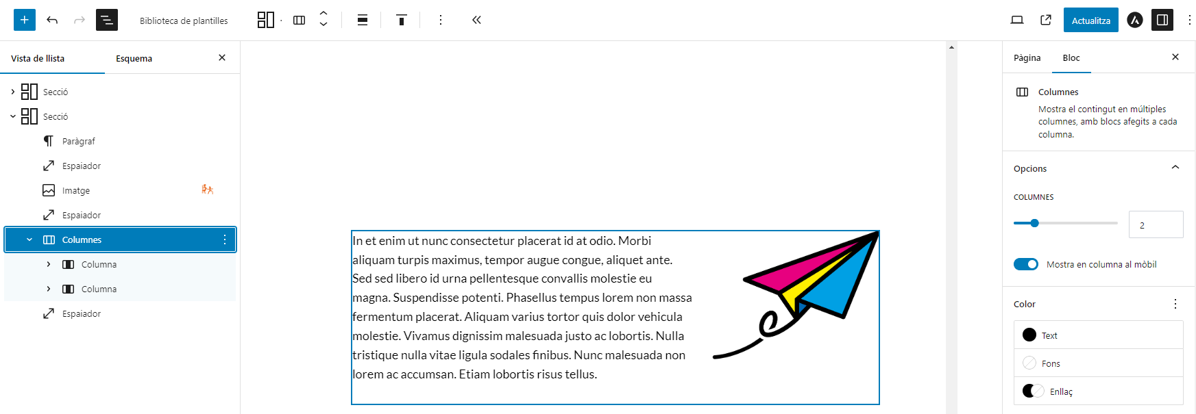 Quan seleccioneu el bloc de Columnes, a la barra lateral dreta tindreu diverses opcions de personalització, on destaquem: