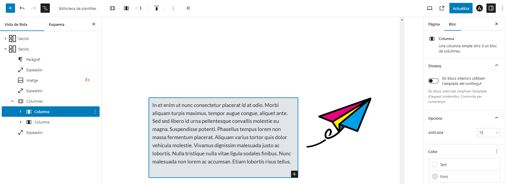 Quan seleccioneu una de les columnes que conformen el bloc, podeu accedir a la barra lateral dreta per a opcions de personalització, entre les quals destaquem: