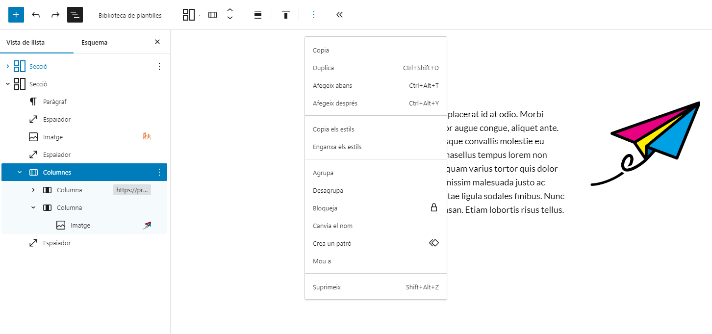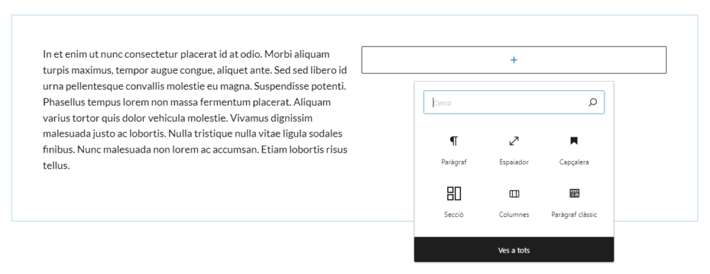 Podeu afegir un bloc Columnes fent clic al botó “+” (Afegir bloc) i cercant “Columnes” o seleccionant-lo de la llista de blocs.