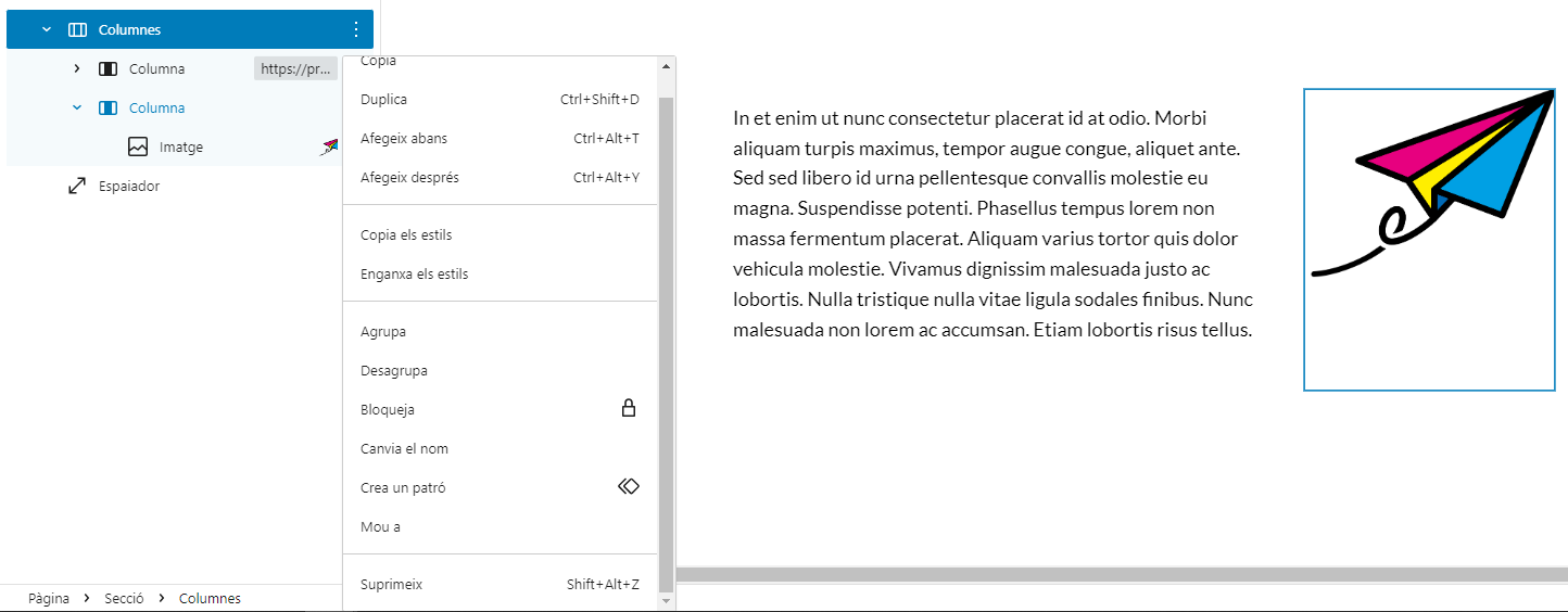 Quan seleccioneu el bloc de Columnes, a la barra lateral dreta tindreu diverses opcions de personalització, on destaquem: