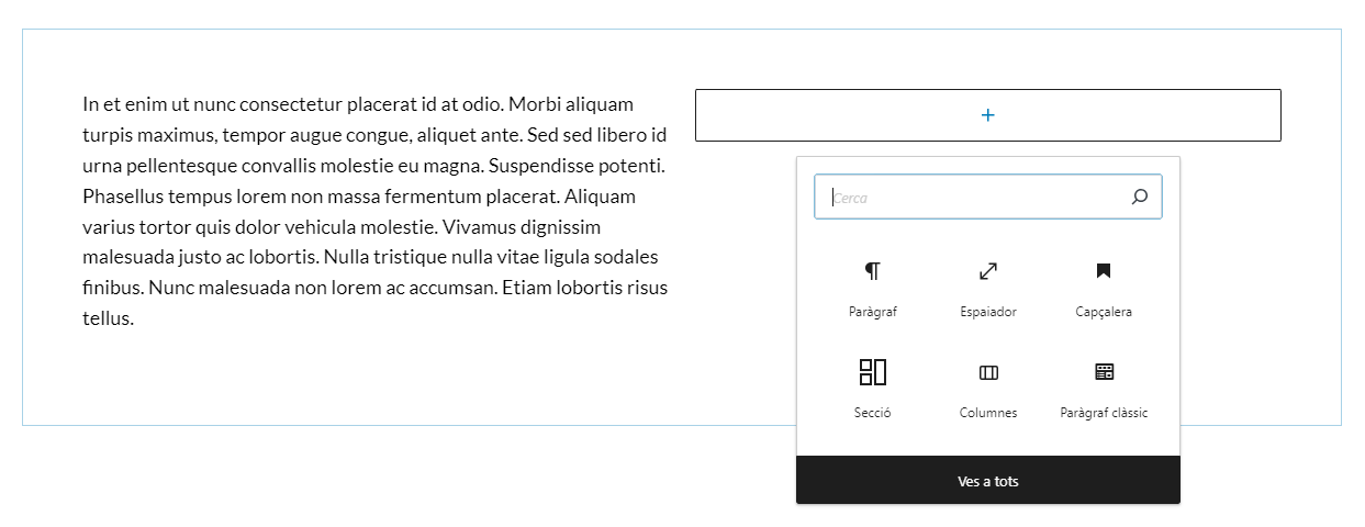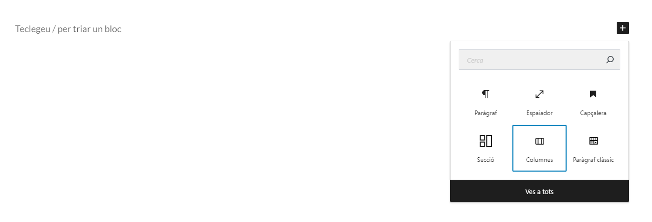 Podeu afegir un bloc Columnes fent clic al botó “+” (Afegir bloc) i cercant “Columnes” o seleccionant-lo de la llista de blocs.