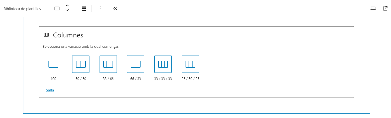 Un cop afegit el bloc Columnes, podreu escollir l’estructura de columnes que desitgeu, sigui dues columnes, tres, o fins i tot més, amb proporcions diferents.