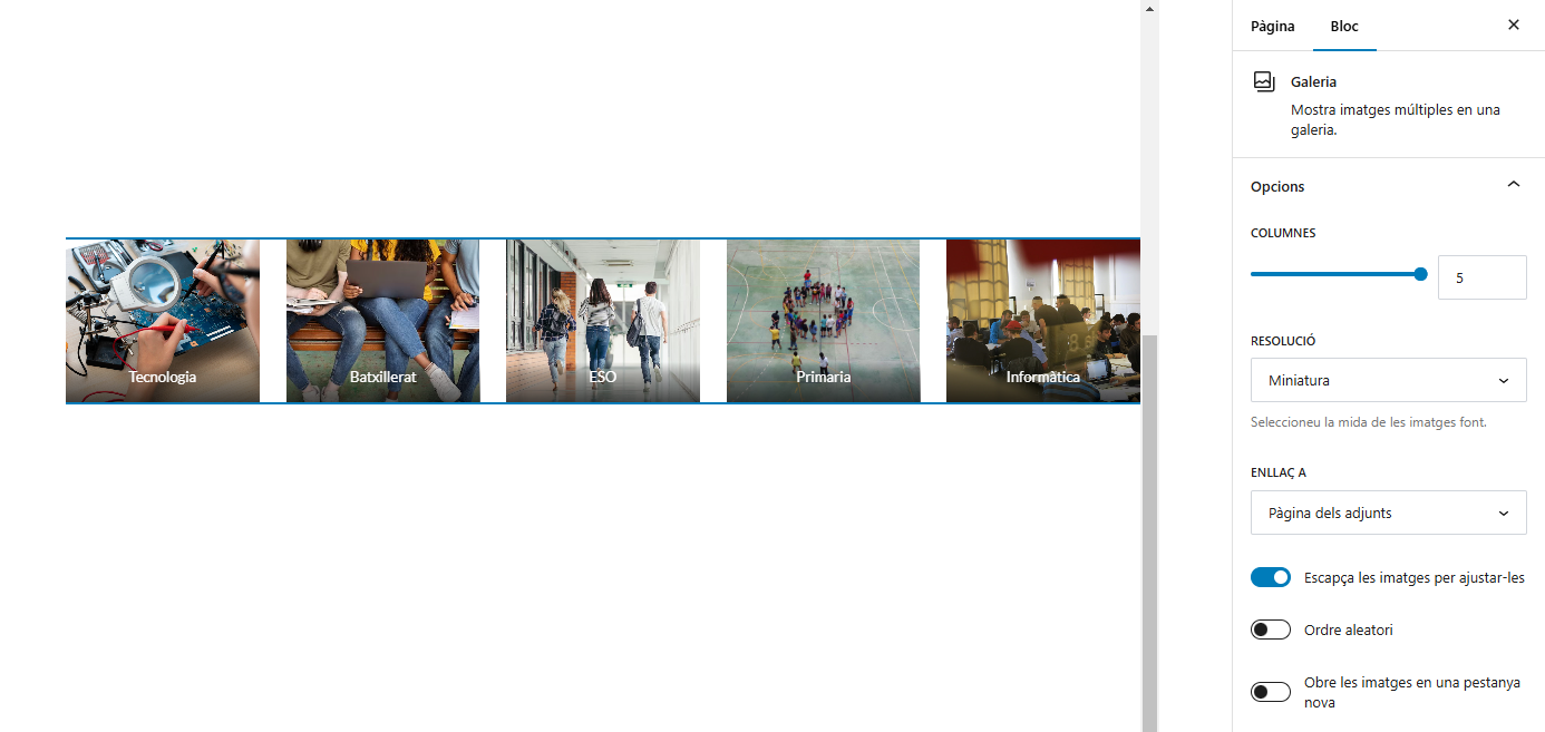 • Nombre de columnes: Aquesta opció et permet escollir la quantitat de columnes que es volen establir per a organitzar les imatges de la galeria, segons l’estètica i la funcionalitat que es vulgui aconseguir. La mida de les imatges s’ajustarà automàticament en cada cas.