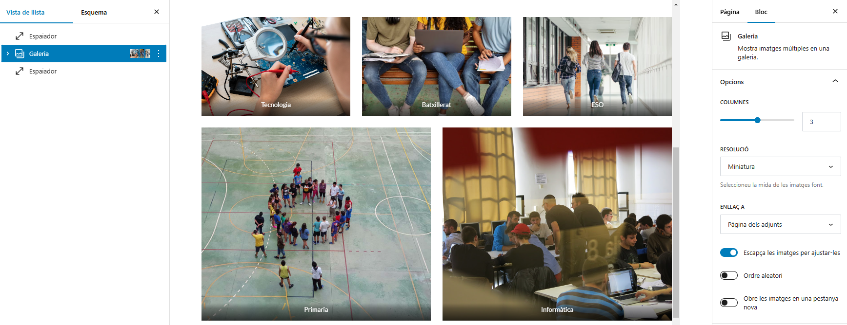 Un cop hàgiu afegit les imatges, veureu diverses opcions de personalització a la barra lateral dreta, com ara el nombre de columnes, la mida de les imatges i l’activació de l’enllaç per obrir-les en una finestra emergent o a la pàgina de fitxer multimèdia.