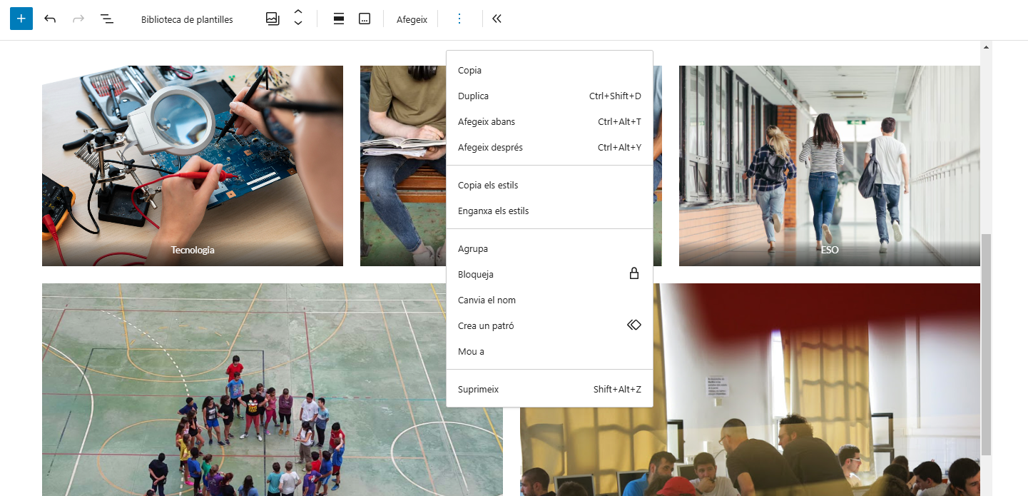 Clicant els tres punts a la barra d’eines, pots accedir a opcions com duplicar el bloc, suprimir-lo, moure’l, i més. També ho pots fer des de la “Vista de llista”.