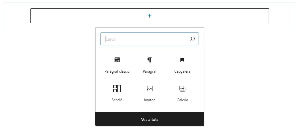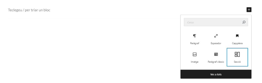 Podeu afegir un bloc Seccions fent clic al botó “+” (Afegir bloc) i cercant “Seccions” o seleccionant-lo de la llista de blocs.