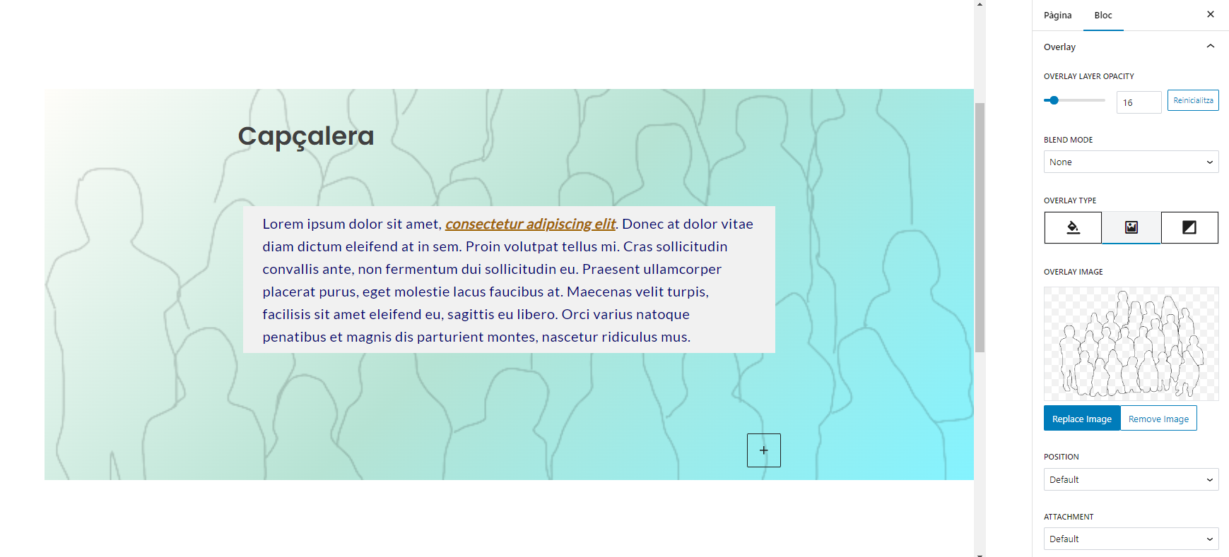 • Capes (Overlay): Podeu posar capes sobre el fons (color sòlid, imatge o color degradat). Aquestes donen l’opció de graduar l’opacitat.