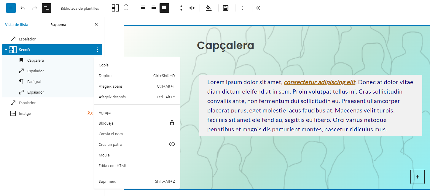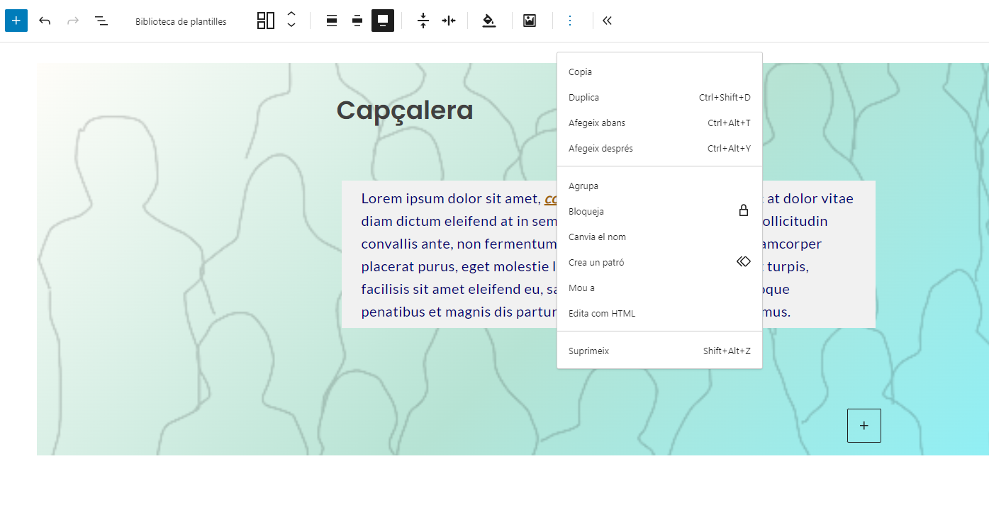 Clicant els tres punts a la barra d’eines, pots accedir a opcions com duplicar el bloc, suprimir-lo, moure’l, i més. També ho pots fer des de la “Vista de llista”.