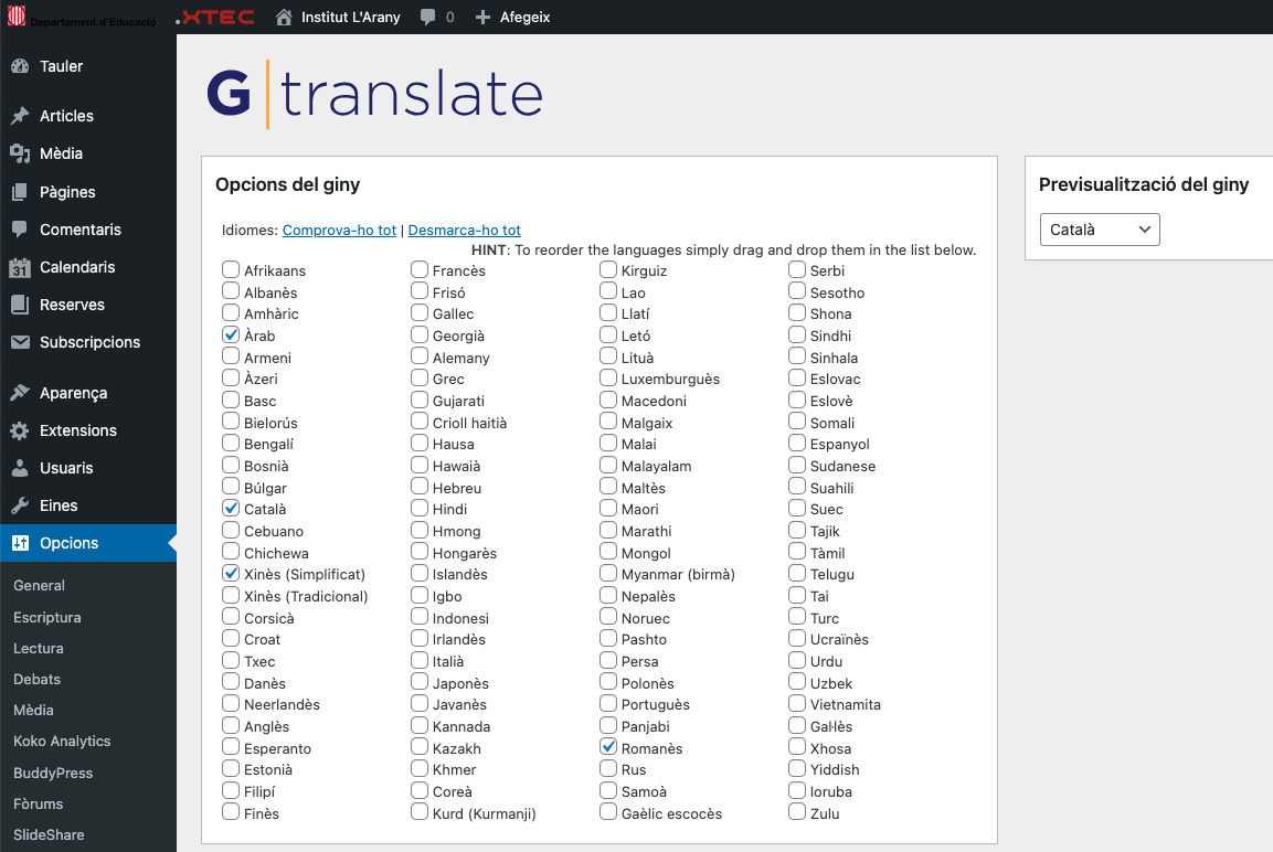 G | translate és una nova extensió que permet traduir el Nodes a multitud d’idiomes. Aneu a: Tauler / Extensions i trobareu l’extensió G | translate Al menú desplegable podeu configurar els idiomes disponibles per a la traducció automàtica de pàgines.