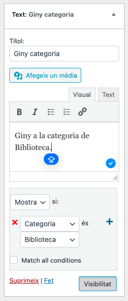 - Categories: els ginys definits en aquesta zona es mostraran a totes les pàgines de categories. Si volem definir que un giny es mostri només en una categoria, cal definir la seva visibilitat a Categoria i el nom de la categoria.