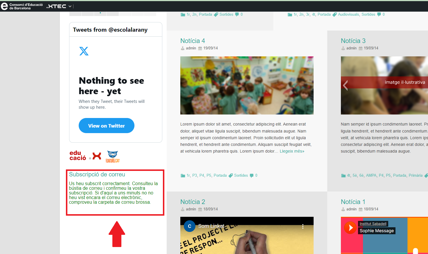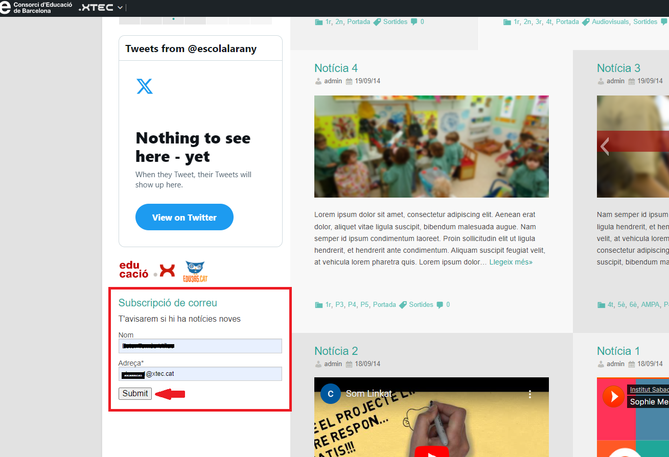 A la imatge podeu veure l’aspecte del giny amb el formulari de subscripció. Ara, l’usuari pot subscriure’s a la llista i rebre un correu cada vegada que hi hagi un nou article vinculat a aquesta llista (en aquest cas, els articles categoritzats com a Portada).