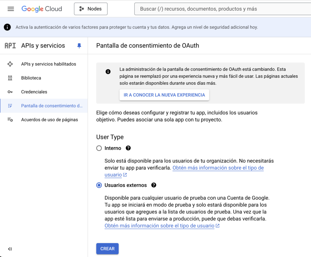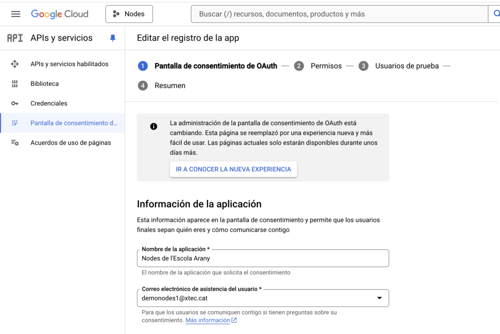 5. Desplega el menú i tria APIs i Servicios -> Pantalla de consentimiento Oauth.