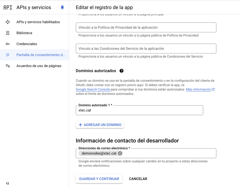 7. Omple el Nom, un correu d’assistència a l’usuari (no és important), afegeix el logotip de l’aplicació i afegeix xtec.cat com a domini autoritzat i un correu de desenvolupador (no és important).