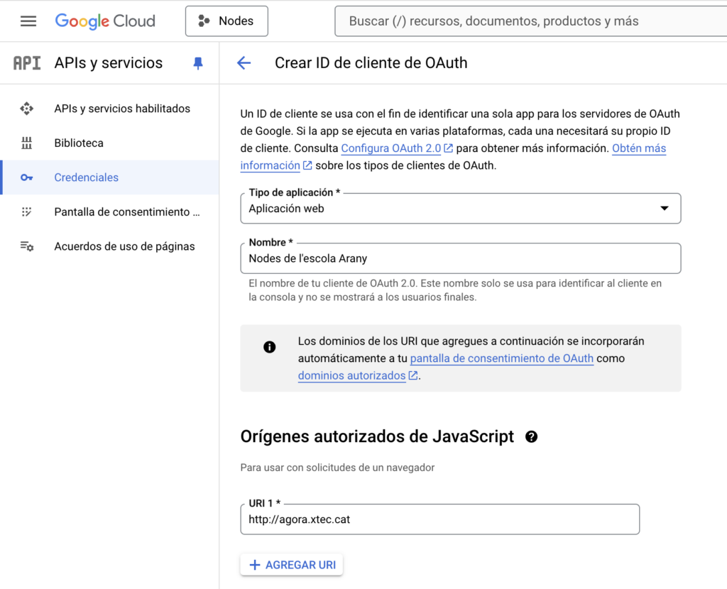 9. A Tipo de Aplicación, selecciona Aplicació web. Posa un nom descriptiu i defineix http://agora.xtec.cat com a Orígenes autorizados de JavaScript.