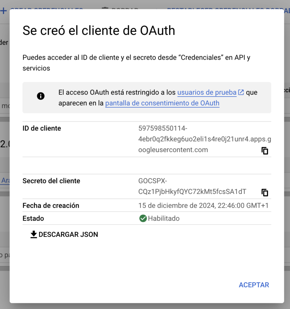 11. Al crear la credencial es crea un ID de cliente i un Secreto de Cliente, que és el que necessitarem definir al Nodes. Copieu-los en un bloc de notes, el necessitarem més endavant.