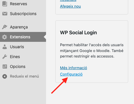 12. Aneu a Tauler -> Extensions -> WP Social Login i feu clic a Configuració.