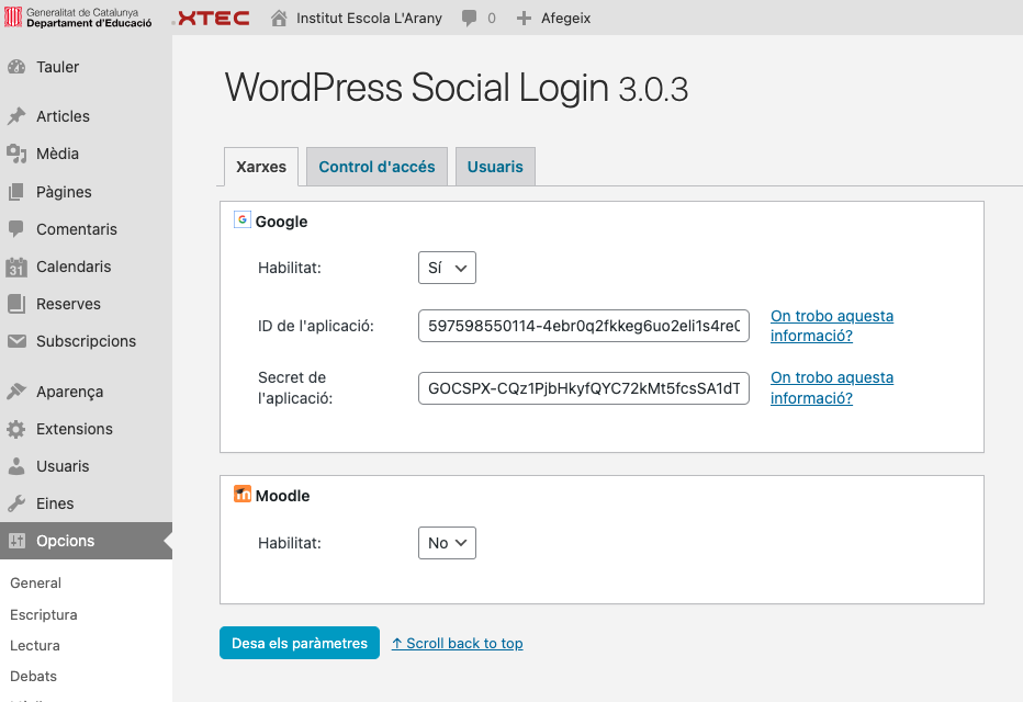 13. Habiliteu Google i enganxeu l’ID de client i el Secret d’aplicació: