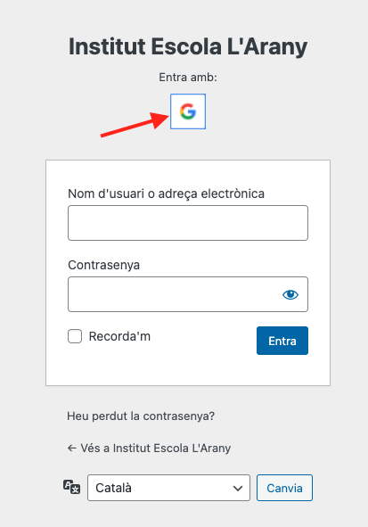 En accedir al tauler del Nodes amb https://agora.xtec.cat/nomdelcentre/wp-admin, apareix un botó de Google. A fer clic directament, apareixerà la validació amb Google. En validar, s’inicia sessió automàticament a Nodes.