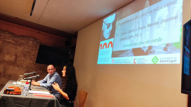 L’alumna de 2n de batxillerat Paula Garcia i el professor Enric Martin, de l’INS Jaume Callís de Vic, van presentar, a la Jornada Pedagògica Gabriel Ferrater, el treball de recerca «Ferrater en clau de corda», que tenia com a objectiu la creació i interpretació d’una peça musical a partir del poema «In memoriam», dins l’obra Da nuces pueris del poeta Gabriel Ferrater.