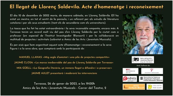 Aquest dijous 26 de gener a les 19 h els Amics de les Arts i Joventuts musicals de Terrassa acullen l’homenatge a Llorenç Soldevila, estudiós de la literatura catalana i autor de la monumental Geografia literària dels Països Catalans.