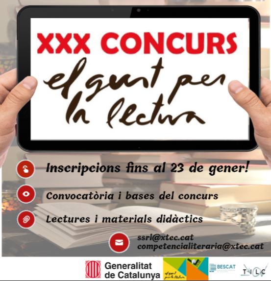 El Servei de Suports i Recursos Lingüístics del Departament d’Educació i Formació Professional ha convocat el XXX Concurs El gust per la lectura, basat en una sèrie de propostes d’obres a les quals s’associen materials didàctics i que podeu consultar en aquest enllaç.