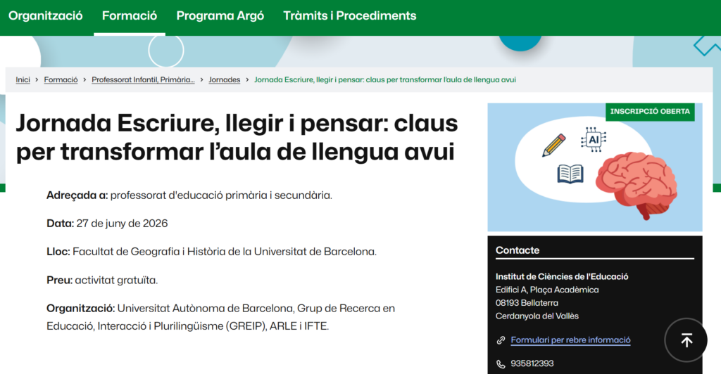 Podeu consultar la descripció de la jornada i el programa en aquest enllaç: Jornada Escriure, llegir i pensar: claus per transformar l’aula de llengua avui – Institut de Ciències de l’Educació (ICE) – UAB Barcelona
