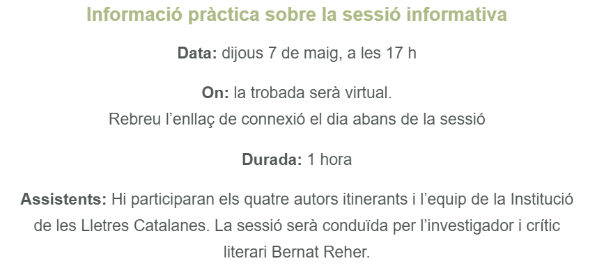 Aquells centres que vulguin organitzar una activitat literària i comptar amb la presència d’algun d’aquests autors, s’hauran d’inscriure i participar en la sessió informativa virtual.