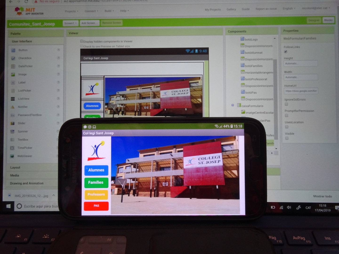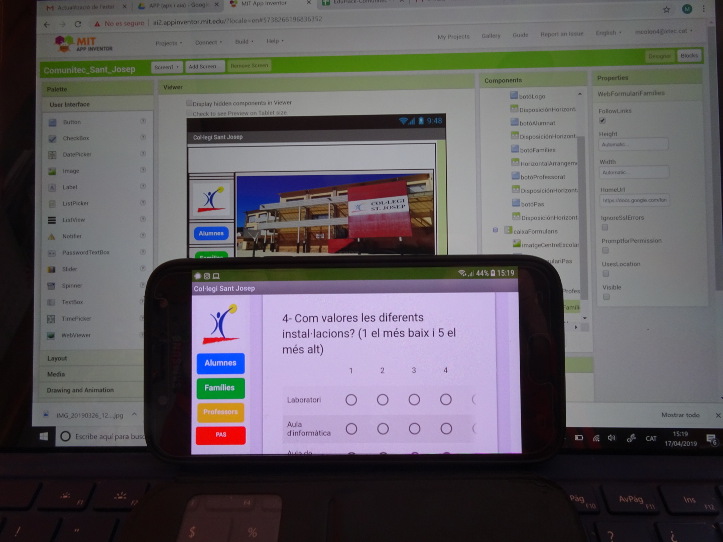 Els alumnes d’ESO3 del Sant Josep finalment han aconseguit personalitzar la nostra APP. Hi han afegit el nom, la foto i el logo de l’escola. També hi han enllaçat els nostres formularis. La connexió ens ha fallat una mica i això ens ha fet retrassar una mica el projecte. Però finalment… activitat aconseguida!
