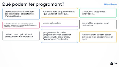 | Activitat pensada per a grups que s’inicien en la programació. Es publicaran els resultats al bloc de l’assignatura (i a les xarxes socials, per promoure la reflexió amb l’entorn educatiu. A twitter, per exemple, es pot fer una enquesta amb quatre de les paraules que els alumnes més han destacat, i després que la gent “voti” donar-los la resposta dels nostres alumnes.