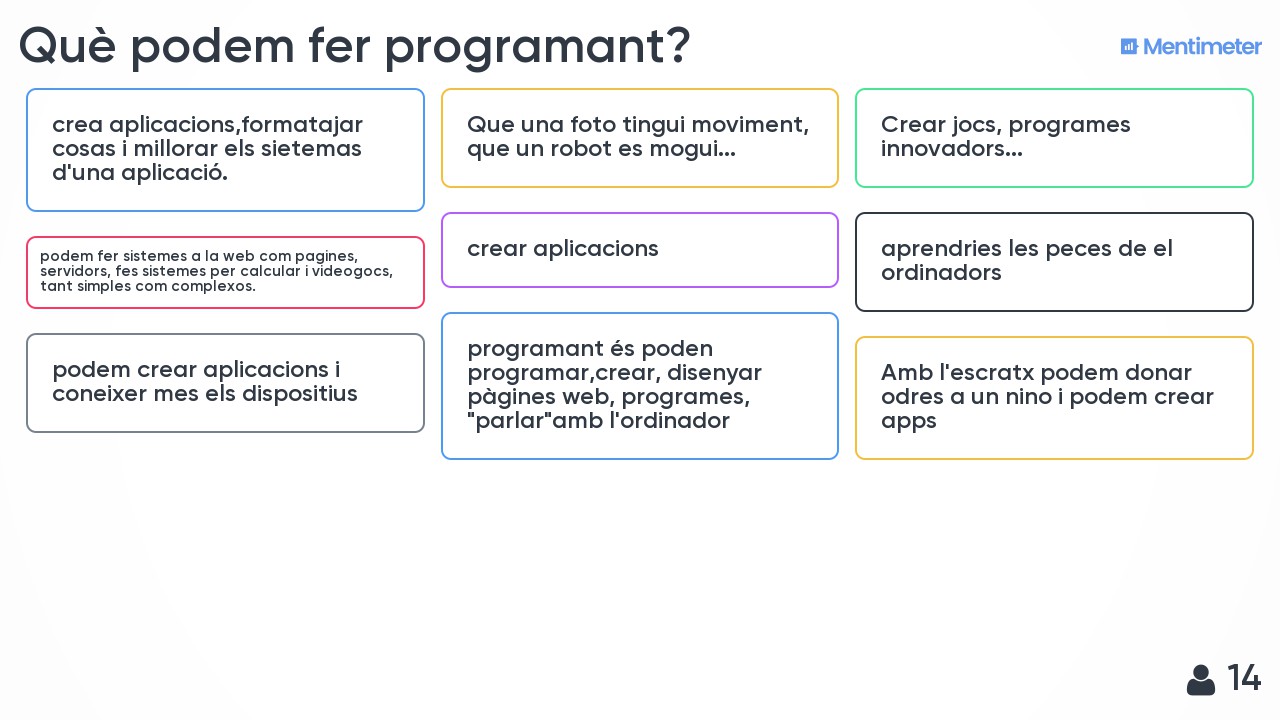 | Activitat pensada per a grups que s’inicien en la programació. Es publicaran els resultats al bloc de l’assignatura (i a les xarxes socials, per promoure la reflexió amb l’entorn educatiu. A twitter, per exemple, es pot fer una enquesta amb quatre de les paraules que els alumnes més han destacat, i després que la gent “voti” donar-los la resposta dels nostres alumnes.