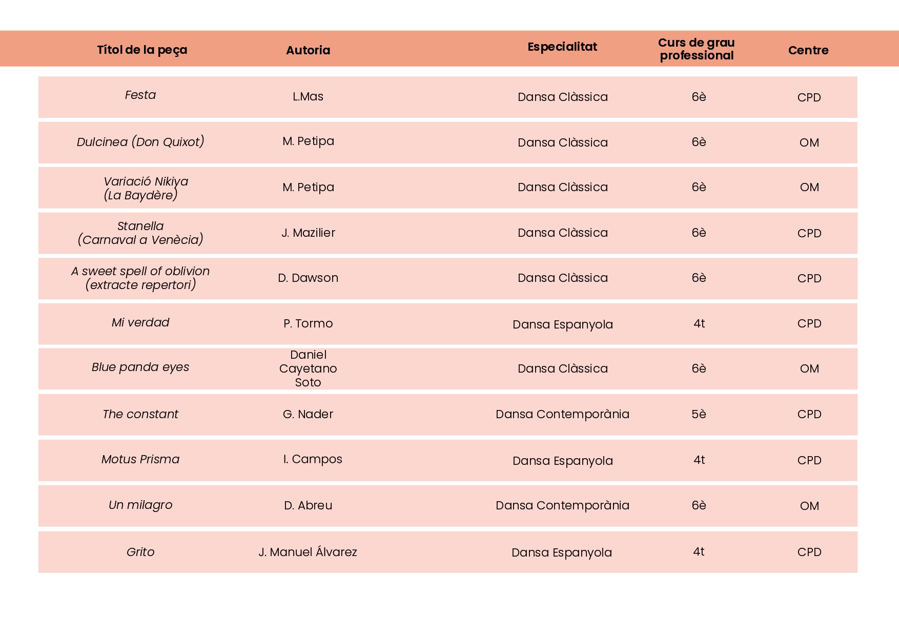 L’espectacle va ser a càrrec de ballarins i ballarines dels dos conservatoris de dansa de Catalunya: l’Institut Escola Artístic Oriol Martorell i Conservatori professional de Dansa de l’Institut del Teatre, que van presentar diverses peces coreogràfiques creades i treballades durant el curs de les tres especialitats de dansa del Grau Professional que s’imparteixen a Catalunya: dansa clàssica, dansa contemporània i dansa espanyola.