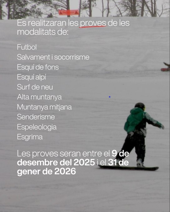 Avui, 20 de novembre, tanquen les inscripcions a les proves específiques d’accés als Ensenyaments esportius. Modalitats de: Futbol, salvament i socorrisme, esquí alpí, esquí de fons, surf de neu, alta muntanya, senderisme, muntanya mitjana, espeleologia i esgrima. Presenta la teva sol·licitud aquí: gen.cat/47ShQOt