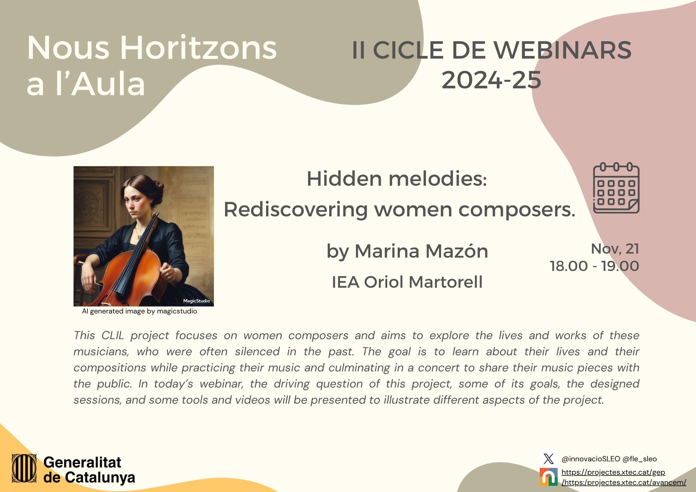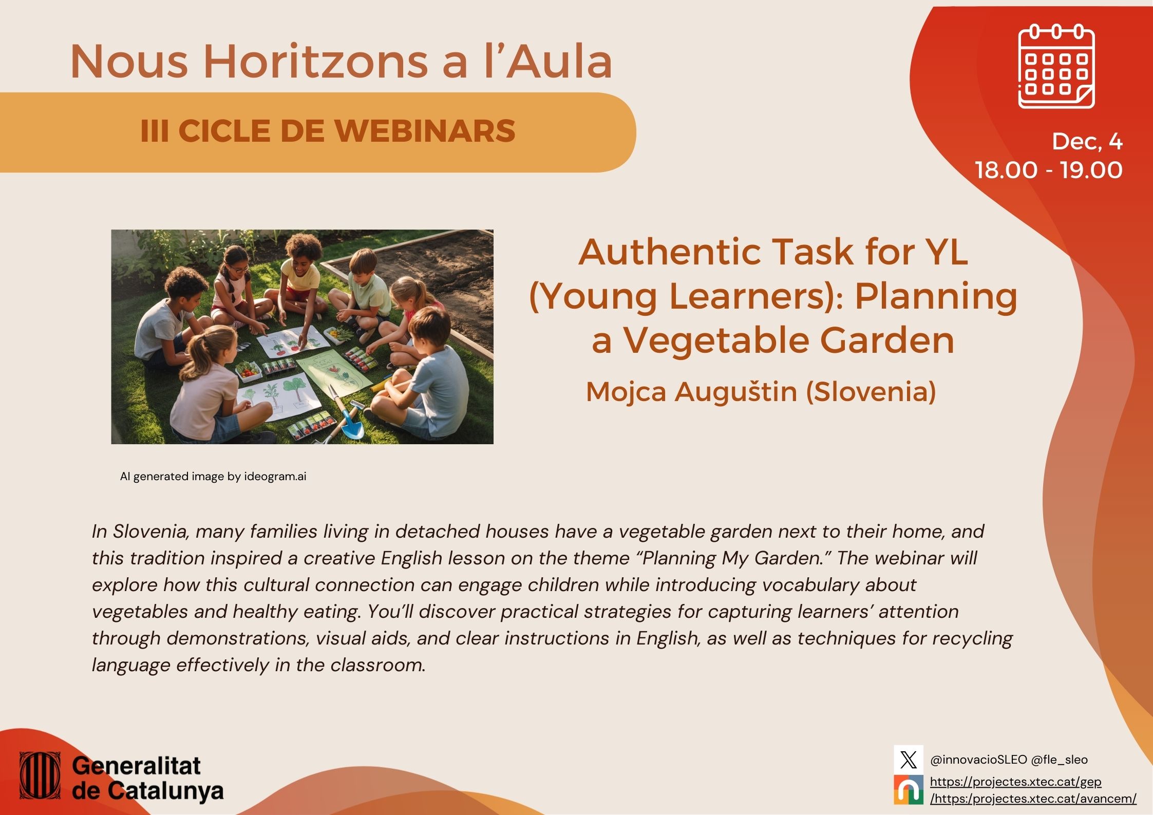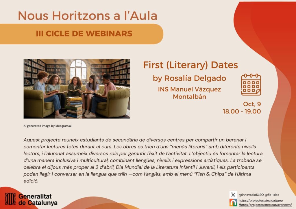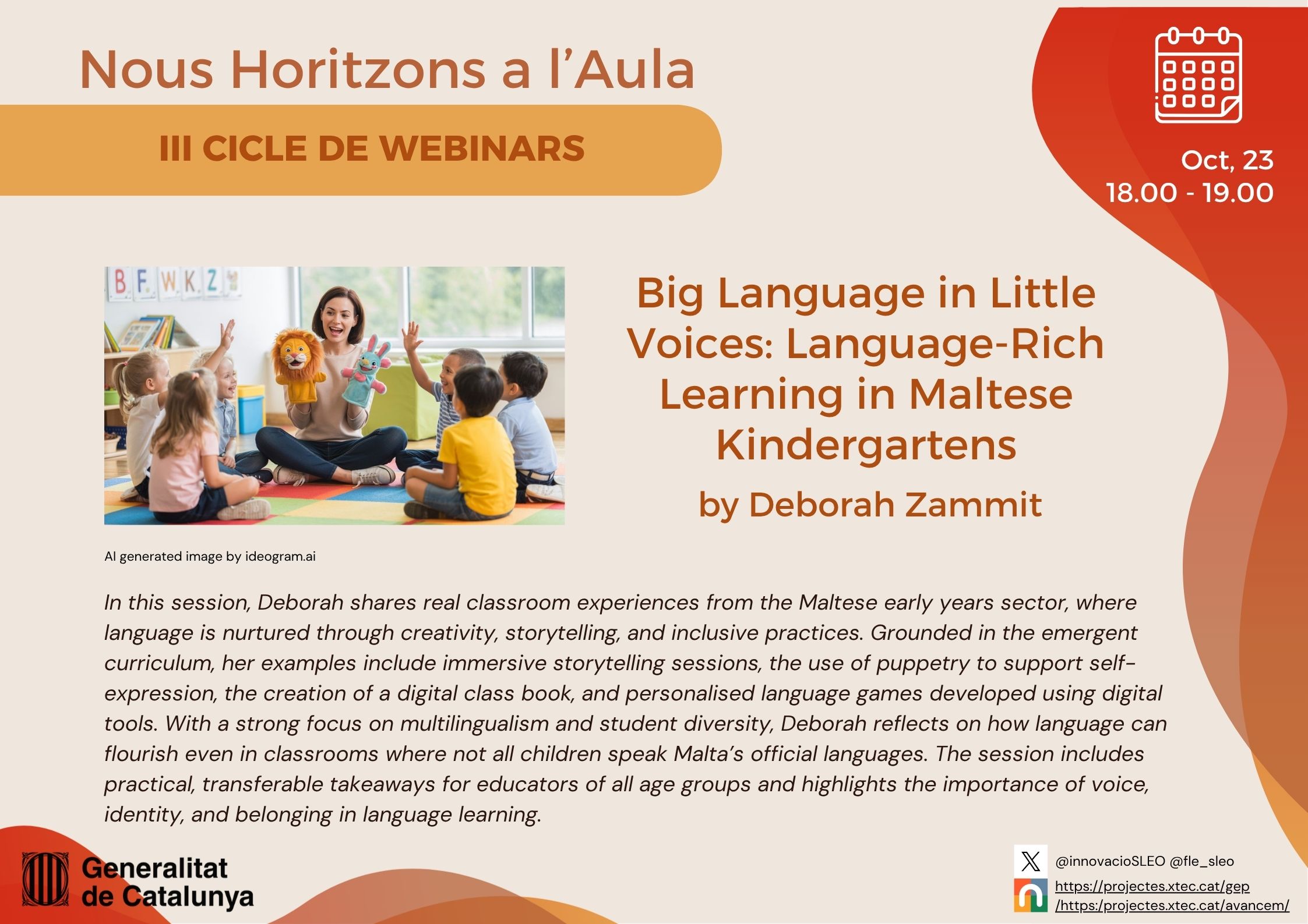 Dijous, 6 de novembre a les 18.00 h, continuem el tercer cicle de webinars Nous Horitzons a l’Aula amb la participació d’Ingrid De la Barrera, docent de llengua estrangera i visual i plàstica a l’ESC El Gegant del Rec (Salt), la qual ens compartirà el seu projecte d’art en llengua anglesa amb alumnat de Cicle Superior d’ed. Primària. Junts exploren com l’art pot reflectir experiències reals, emocions i esdeveniments, tot connectant amb un aprenentatge significatiu a través de l’enfocament AICLE. Durant el webinar també es presenta com les escoles poden col·laborar en projectes artístics a través de eTwinning, connectant alumnes de diferents indrets a través de la creativitat.