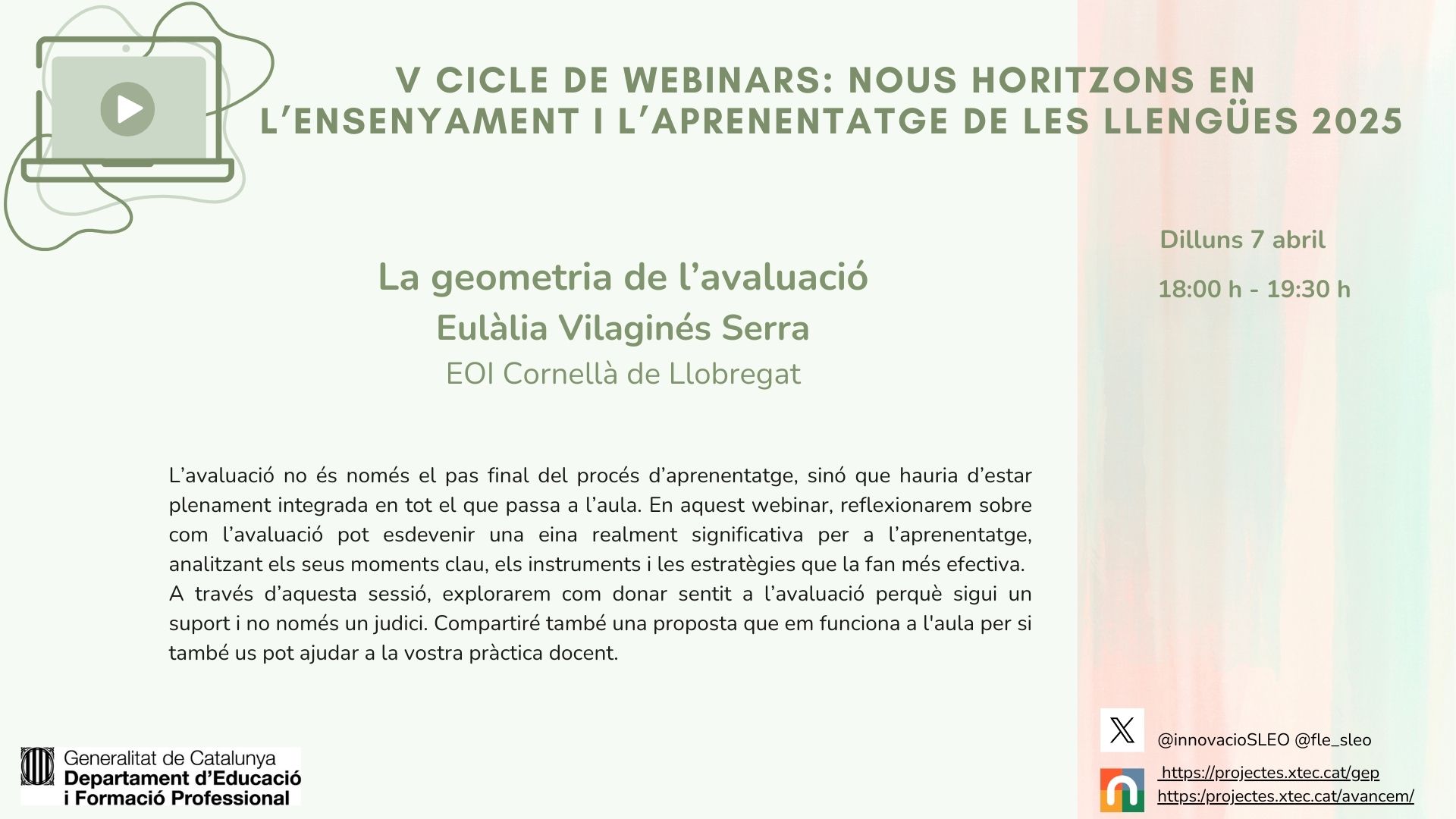 T’esperem el pròxim dilluns 28 d’abril a les 18.00 h al setè webinar del V cicle “Nous Horitzons en l’Ensenyament i l’Aprenentatge de les Llengües” 2025 amb la participació d’ Elisenda Gozalo Salellas, professora d’anglès a l’Escola Oficial d’Idiomes i a  l’Institut Obert de Catalunya.