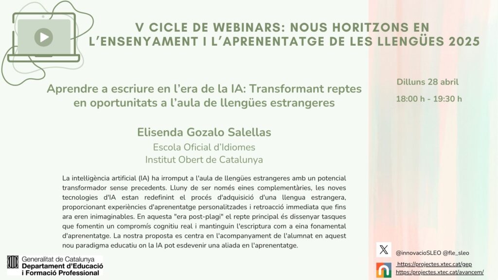 Webinar #7 Aprendre a escriure en l’era de la IA: Transformant reptes en oportunitats a l’aula de llengües estrangeres a càrrec d’Elisenda Gozalo