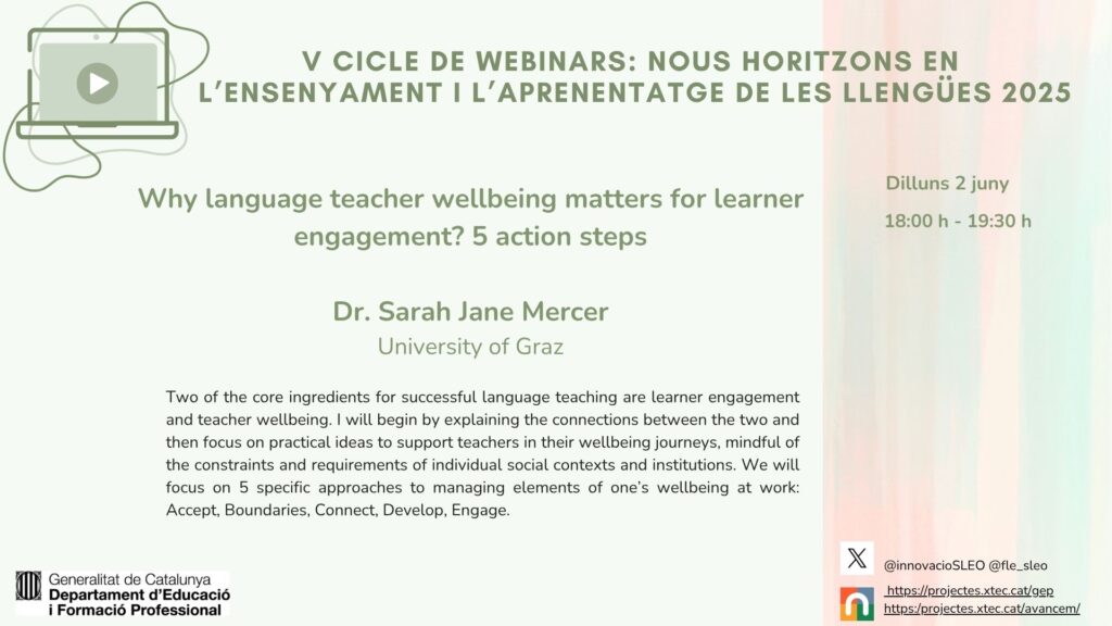 T’esperem el proper dilluns 2 de juny a les 18.00 h al desè i últim webinar del V cicle de “Nous Horitzons en l’ensenyament i l’aprenentatge de les llengües 2025”. Dilluns comptarem amb la participació de la Dra. Sarah Jane Mercer, professora a la Universitat de Graz, Àustria, amb qui explorarem dos dels aspectes centrals a l’hora de promoure l’aprenentatge d’una llengua: compromís i implicació de l’alumnat i el benestar del professorat. Durant el webinar descobrirem idees pràctiques per acompanyar el professorat en el seu dia a dia a l’aula i al centre educatiu.