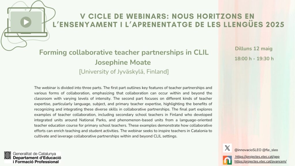 T’esperem el pròxim dilluns 12 de maig a les 18.00 h al vuitè webinar del V cicle “Nous Horitzons en l’Ensenyament i l’Aprenentatge de les Llengües” 2025 amb la participació de la Dra. Josephine Moate, investigadora i formadora de professorat de la Universitat de Jyväskylä, Finlàndia.