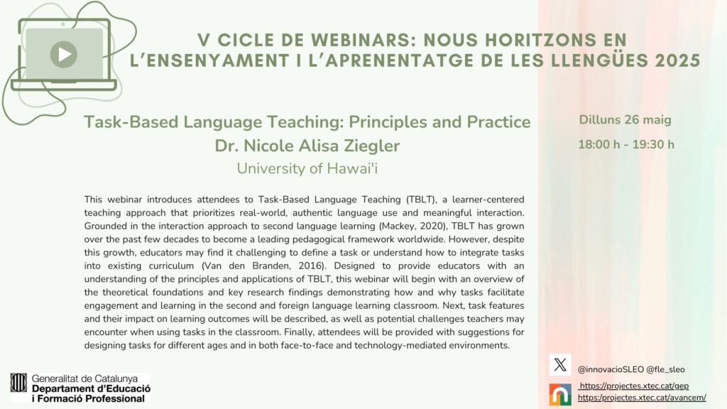 Aquest webinar introdueix l’Ensenyament de Llengües Basat en Tasques (TBLT), un mètode centrat en l’alumne que prioritza l’ús real de la llengua i la interacció. S’hi exploren les bases teòriques, la recerca i les aplicacions pràctiques. Els docents aprendran a dissenyar tasques, afrontar reptes i aplicar estratègies per a diferents edats i entorns, també digitals.