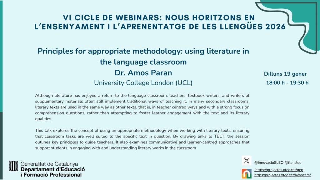 Iniciem el cicle d’enguany amb la col·laboració del Dr Amos Paran, professor de TESOL a l’Institut d’Educació del University College London, que ens parlarà sobre el paper de la literatura en l’ensenyament de llengües estrangeres i segones llengües. En la seva intervenció presentarà el concepte de metodologia apropiada, que defensa la necessitat d’adaptar les activitats de lectura a les característiques específiques de cada text literari i així crear oportunitats perquè l’alumnat pugui gaudir del text, interpretar-lo i participar-hi de manera activa, anant més enllà de les típiques preguntes de comprensió. El pròxim 19 de gener a les 18.00h, No us perdeu aquesta magnífica oportunitat d’aprendre de la mà del Dr. Paran i d’explorar noves maneres de treballar la literatura a l’aula.