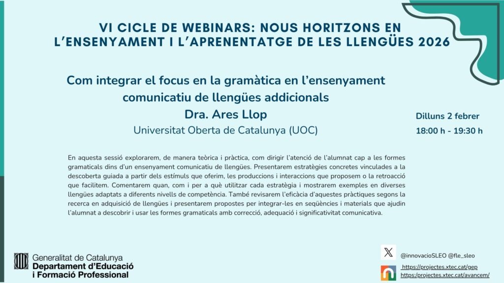T’esperem el dilluns 2 de febrer, a les 18.00 h, al segon webinar del VI cicle de webinars Nous horitzons en l’ensenyament i l’aprenentatge de les llengües 2026. En aquesta sessió comptarem amb la participació de la Dra Ares Llopdoctora en Lingüística per la Universitat Autònoma de Barcelona especialitzada en la variació i canvi lingüístic en la sintaxi de les llengües del contínuum romànic pirinenc. La Dra Llop ens oferirà una mirada clara i aplicable sobre com i perquè utilitzar certes estratègies per dirigir l’atenció de l’alumnat cap a les formes gramaticals dins d’un ensenyament comunicatiu de llengües.