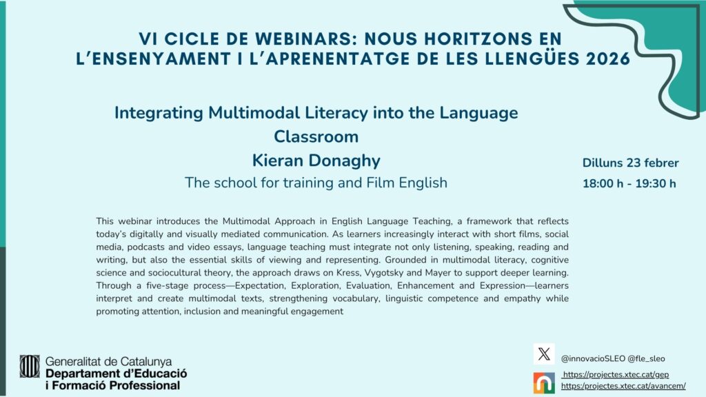 Dilluns, 23 de febrer a les 18.00 h, continuem el VI cicle de webinars Nous horitzons en l’ensenyament i l’aprenentatge de les llengües 2026 amb la participació de Kieran Donaghy, escriptor, formador de docents i conferenciant internacional, fundador de The school for trainning i Film English. El webinar d’aquesta setmana presenta l’enfocament multimodal que integra imatges, digitalitat i llenguatge per afavorir un aprenentatge més profund, inclusiu i significatiu a l’aula d’anglès.