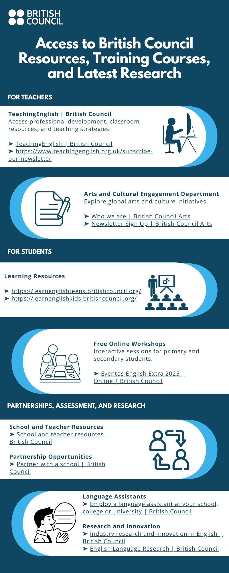 Gràcies a l’acord de col·laboració entre el Departament d’Educació i Formació Professional i el British Council de Barcelona, aprovat per Acord del Govern de 14 d’octubre de 2025, el professorat i la comunitat educativa disposen d’accés a una àmplia oferta de recursos, iniciatives de recerca i propostes de formació permanent vinculades a l’ensenyament de la llengua anglesa.