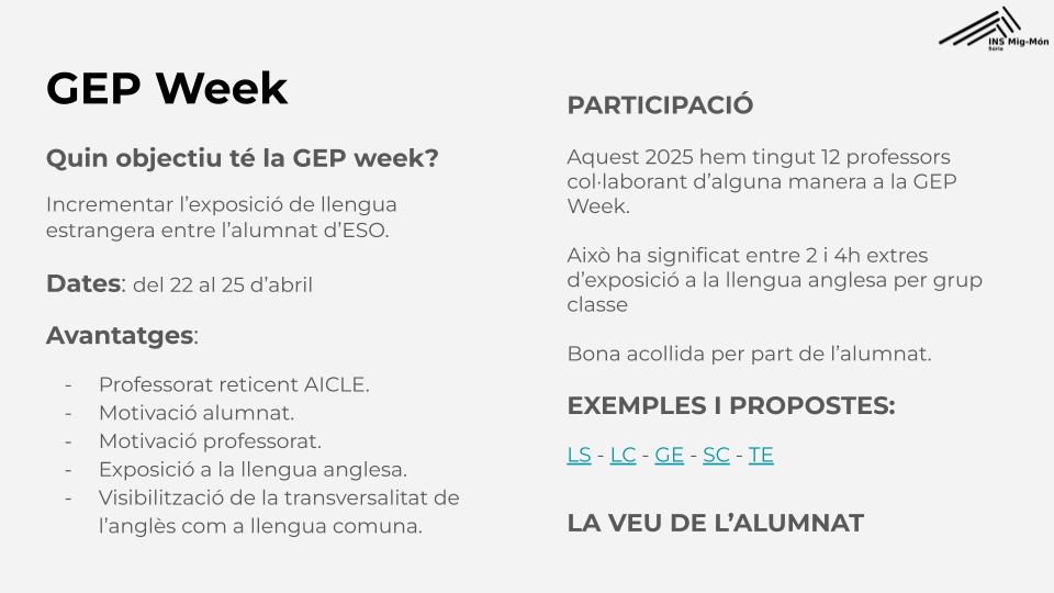 A l’INS MIg-Món, el 25 d’abril, el grup impulsor i representants de l’alumnat van compartir la seva proposta de GEP Week. Aquesta proposta respon a la voluntat del centre per motivar el professorat i implicar-lo en la implementació de sessions AICLE en diverses matèries i nivells durant una setmana, i així contribuir a incrementar l’exposició de llengua estrangera entre l’alumnat, com a complement de les matèries AICLE programades a l’ESO durant el curs. Una molt bona iniciativa de centre que va creixent poc a poc!