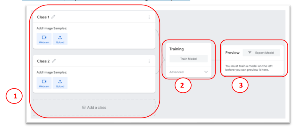 A la zona de l’esquerra [1] és on s’afegeixen les imatges de referència dels objectes que es volen identificar amb la intel·ligència artificial. En aquest cas, les diferents peces de fusta del joc. Per defecte hi ha dues classes, però s’hi poden afegir més. La zona central [2] servirà per entrenar (Training) el model d’intel·ligència artificial a partir de les imatges de referència. Si les imatges són prou clares i amb prou trets distintius entre elles, no serà necessari utilitzar els paràmetres avançats.