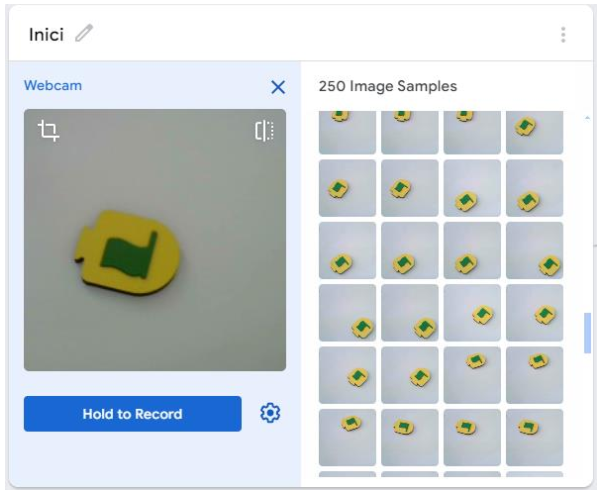 En funció del projecte i dels objectes que es vulguin identificar, seran necessàries una quantitat diferent d’imatges de referència. Pel cas de les peces de fusta del Scratch Jr Tactile, es recomana un mínim de 200 captures per cada peça. A més, tal com s’ha dit anteriorment, és important que cada captura sigui diferent de l’anterior i s’agafin variacions de la posició (centrada, a un costat, rotada…). En el model que es presenta en aquesta guia, s’han obtingut 250 imatges per cada mostra.