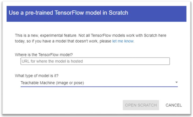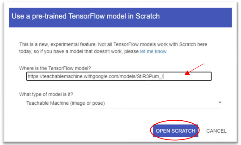 Pas 6. Enganxar l’enllaç del model d’IA que s’ha obtingut a l’últim pas de la secció C (pas 22) per després prémer el botó OPEN SCRATCH