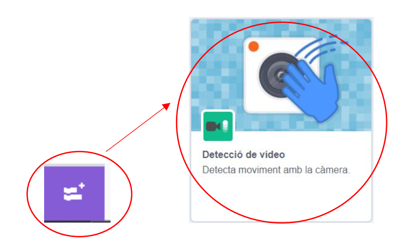 Pas 11. En començar l’aplicació també s’ha d’activar la webcam. Per fer-ho, primer s’ha d’incloure una extensió anomenada “Detecció de vídeo”. Cal prémer la cantonada inferior esquerra de l’entorn de programació per obrir les extensions i seleccionar aquesta: